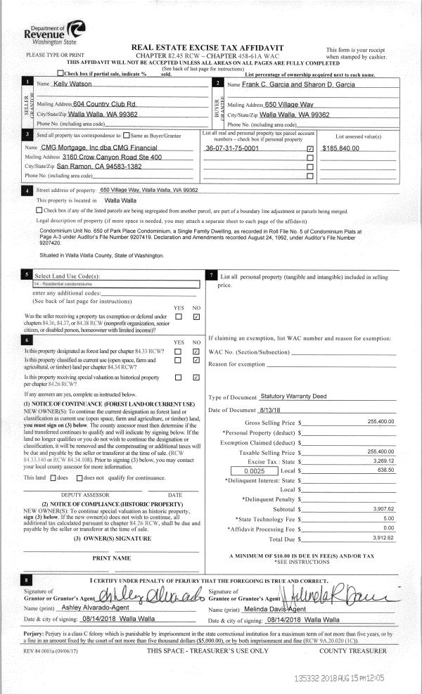 | 1 | 08/15/2018 | SWD | STATUTORY WARRANTY DEED | WATSON KELLY | GARCIA FRANK C & SHARON D | | | $255,400.00 | 135332 | 2018-06685 |