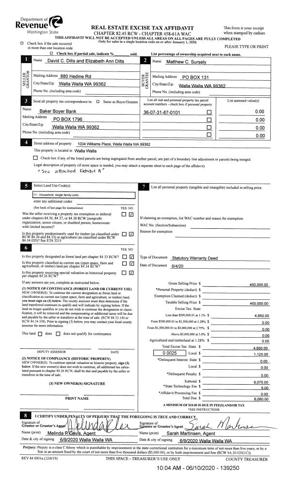 | 1 | 06/10/2020 | SWD | STATUTORY WARRANTY DEED | DILTS DAVID C & ELIZABETH | SURSELY MATTHEW C | | | $450,000.00 | 139250 | 2020-05193 |
