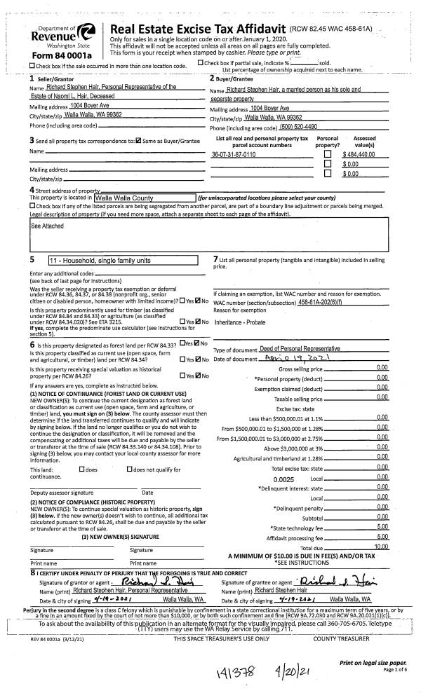 | 2 | 02/27/2017 | DPR | DEED OF PERSONAL REPRESENTATIVE | HAIR RICHARD E & NAOMI L | HAIR NAOMI L | | | $0.00 | 131987 | 2017-01755 |