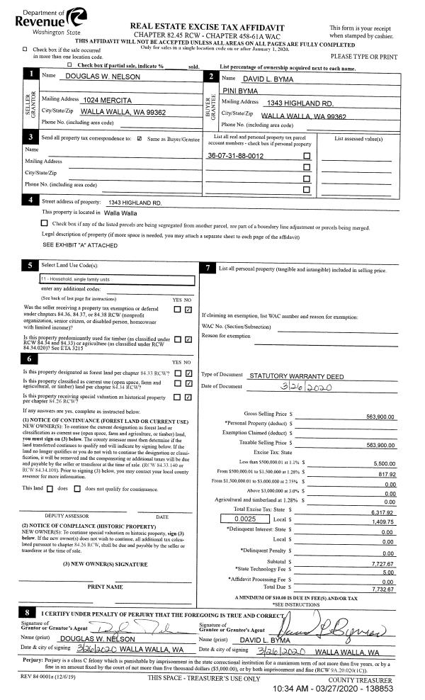 | 1 | 03/27/2020 | SWD | STATUTORY WARRANTY DEED | NELSON DOUGLAS W | BYMA DAVID L & PINI G | | | $563,900.00 | 138853 | 2020-02698 |