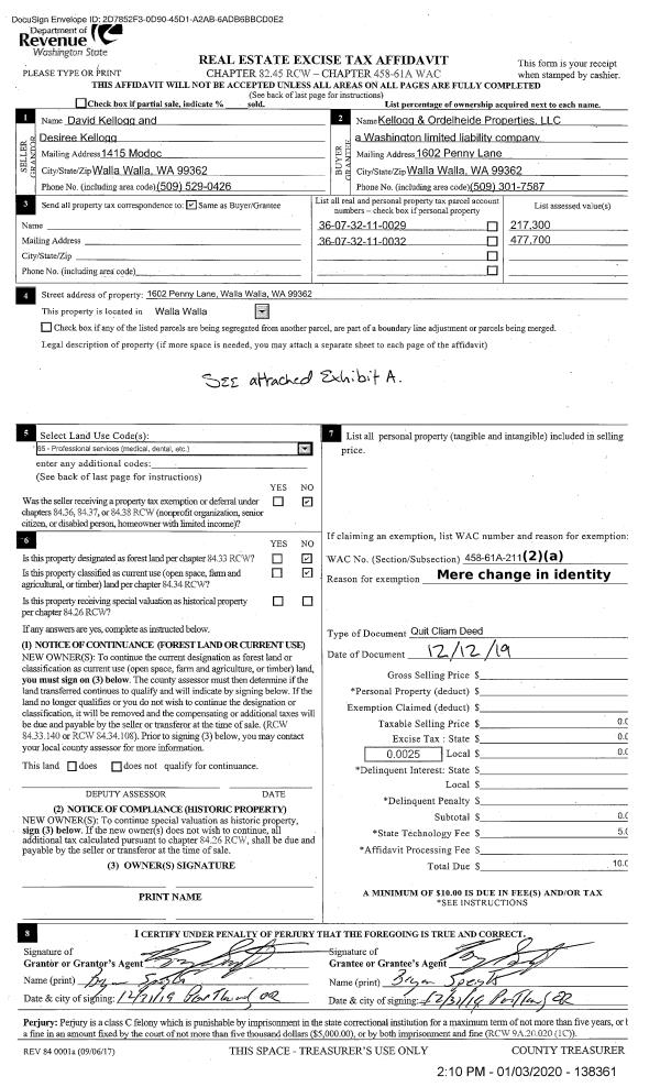 | 3 | 12/16/2019 | QCD | QUIT CLAIM DEED | KELLOGG DONALD R & LINDA J | KELLOGG PARTNERS LLC | | | $0.00 | 138360 | 2020-00064 |