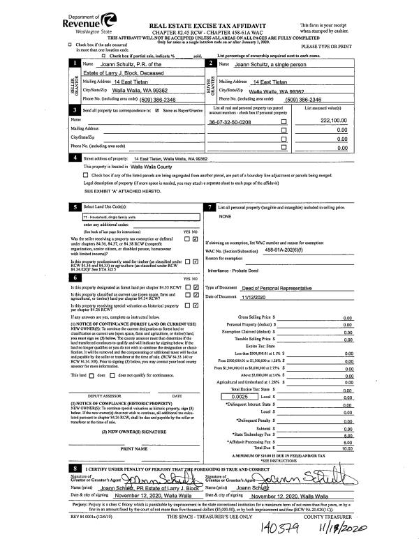 | 1 | 11/19/2020 | DPR | DEED OF PERSONAL REPRESENTATIVE | BLOCK LARRY J | SCHULTZ JOANN | | | | 140379 | 2020-12248 |