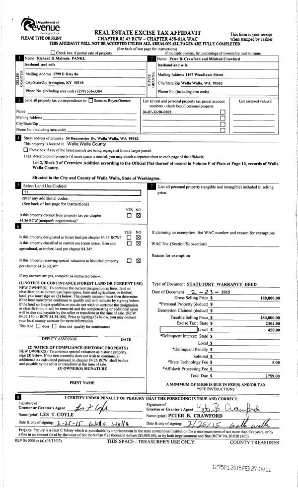 | 2 | 02/27/2015 | SWD | STATUTORY WARRANTY DEED | PANKL RICHARD & MALINDA | CRAWFORD PETER B & MILDRED S | | | $180,000.00 | 127501 | 2015-01750 |