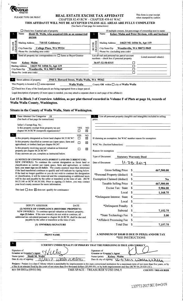 | 1 | 12/12/2017 | SWD | STATUTORY WARRANTY DEED | WELLS HEIDI M | DEVISON PETER | | | | 133773 | 2017-10032 |