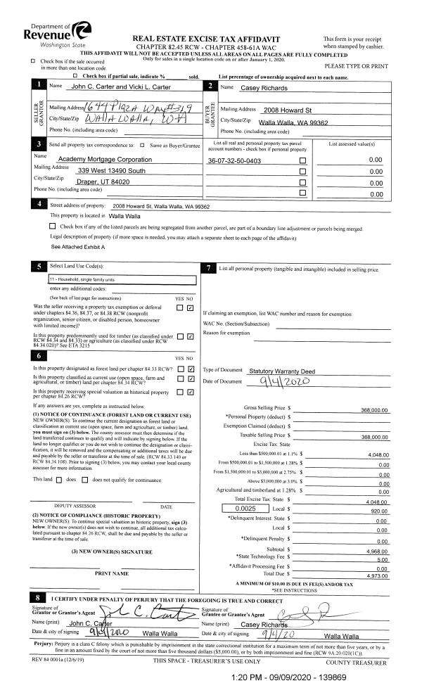 | 1 | 09/09/2020 | SWD | STATUTORY WARRANTY DEED | CARTER JOHN C & VICKI L | RICHARDS CASEY | | | $368,000.00 | 139869 | 2020-09143 |