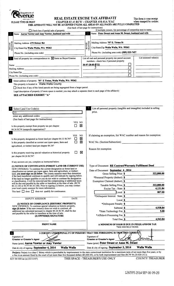 | 5 | 09/04/2014 | REAL ESTAT | REAL ESTATE CONTRACT | VAWTER AARON & AMY | SWANT PETER & ANNE M | | | $322,800.00 | 126595 | 2014-06547 |