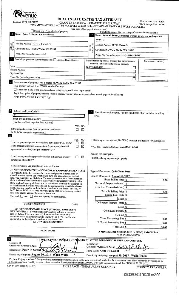 | 3 | 08/30/2017 | QCD | QUIT CLAIM DEED | SWANT PETER & ANNE M | SWANT ANNE M | | | $0.00 | 133129 | 2017-06853 |