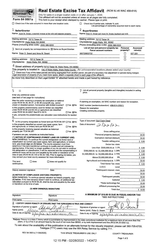 | 2 | 02/22/2022 | QCD | QUIT CLAIM DEED | SWANT ANNE M | SWANT PETER & ANNE M | | | $0.00 | 143472 | 2022-01730 |