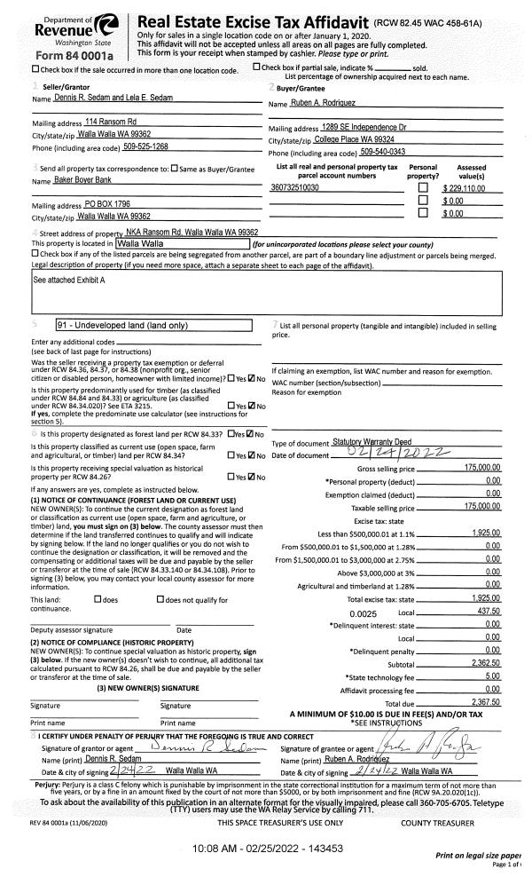 | 2 | 02/25/2022 | SWD | STATUTORY WARRANTY DEED | SEDAM DENNIS R & LELA E | RODRIGUEZ RUBEN A | | | $175,000.00 | 143453 | 2022-01666 |