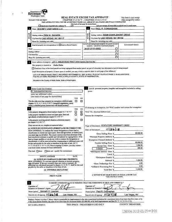 | 3 | 11/29/2018 | SWD | STATUTORY WARRANTY DEED | BOOBEY VINEYARDS LLC | CONNAGHAN PAUL R | | | $80,000.00 | 136006 | 2018-09860 |