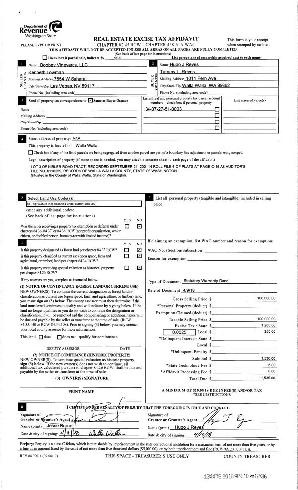 | 3 | 04/10/2018 | SWD | STATUTORY WARRANTY DEED | BOOBEY VINEYARDS LLC | REYES HUGO J & TAMMY L | | | $100,000.00 | 134476 | 2018-02739 |