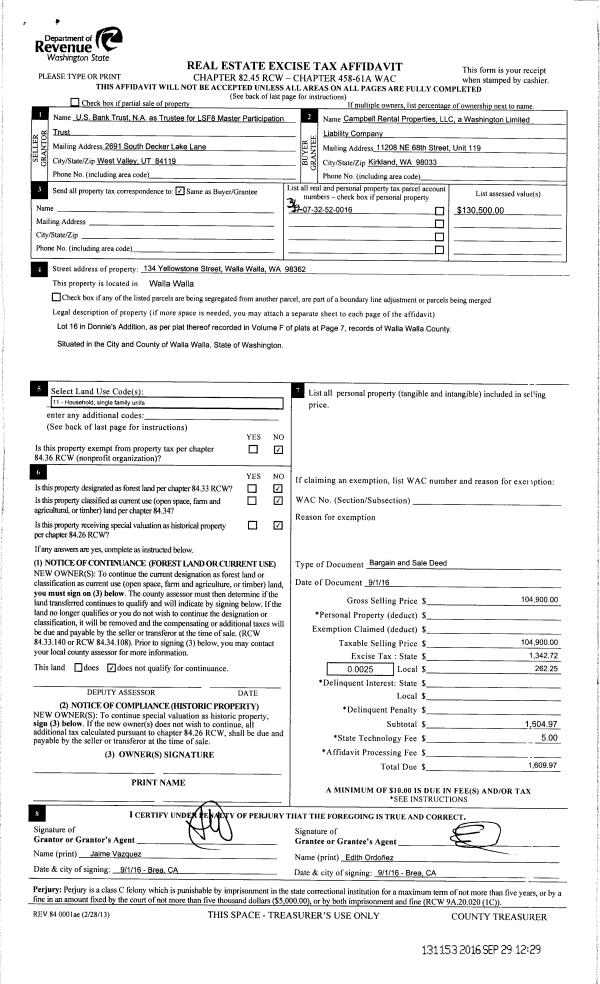 | 2 | 09/29/2016 | BARGAIN & | BARGAIN & SALE DEED | US BANK TRUST NA | CAMPBELL RENTAL PROPERTIES LLC | | | $104,900.00 | 131153 | 2016-08031 |