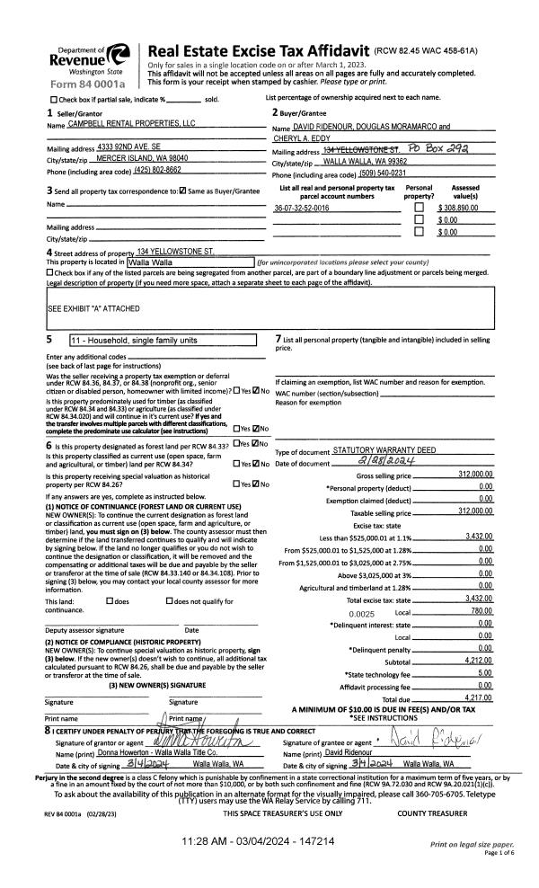 | 1 | 03/04/2024 | SWD | STATUTORY WARRANTY DEED | CAMPBELL RENTAL PROPERTIES LLC | RIDENOUR DAVID | | | $312,000.00 | 147214 | 2024-01068 |