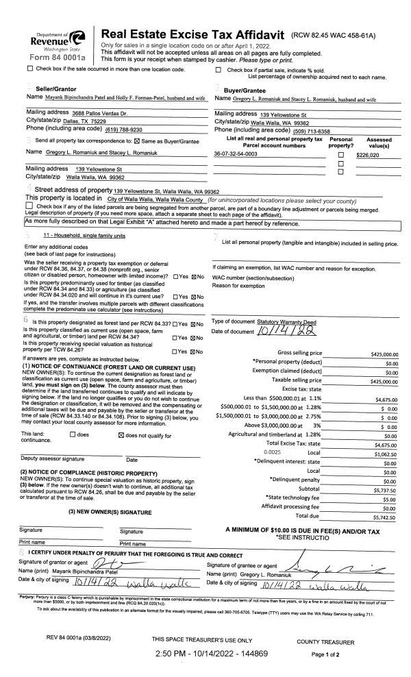 | 2 | 10/14/2022 | SWD | STATUTORY WARRANTY DEED | PATEL MAYANK BIPINCHANDRA & HOLLY F FORMAN | ROMANIUK GREGORY L & STACEY L | | | $425,000.00 | 144869 | 2022-08463 |