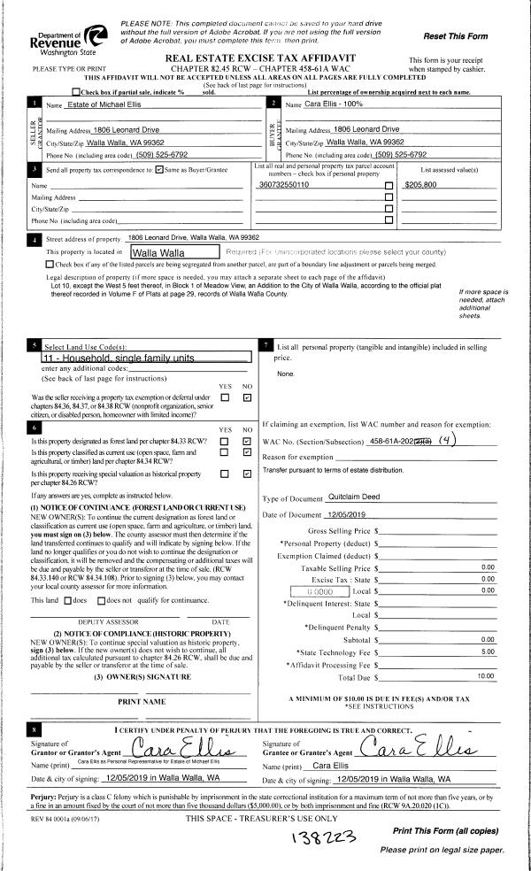 | 2 | 12/05/2019 | QCD | QUIT CLAIM DEED | ELLIS MICHAEL D | ELLIS CARA | | | $0.00 | 138223 | 2019-10206 |