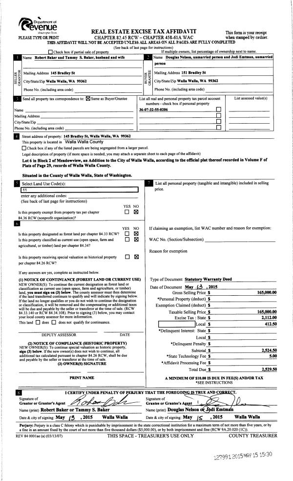 | 2 | 05/15/2015 | SWD | STATUTORY WARRANTY DEED | BAKER ROBERT & TAMMY S | NELSON DOUGLAS | | | $165,000.00 | 127991 | 2015-04152 |