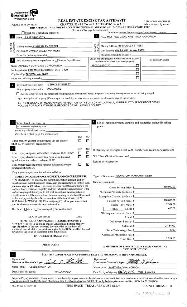 | 4 | 06/14/2016 | SWD | STATUTORY WARRANTY DEED | STOCKTON LESLIE | HALVORSON MATTHEW G & KRISTINA A | | | $180,000.00 | 130412 | 2016-04544 |