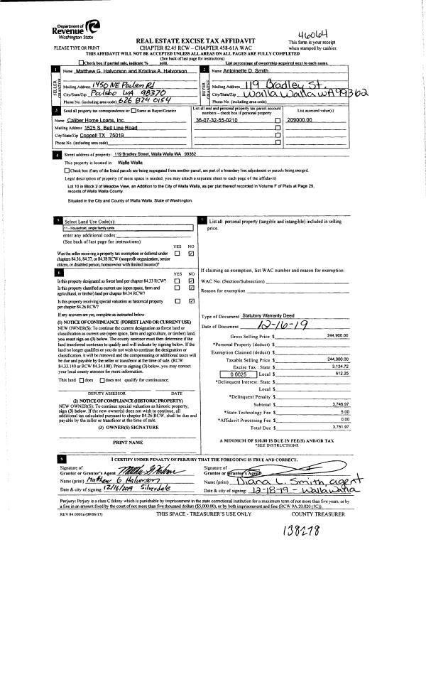 | 3 | 12/19/2019 | SWD | STATUTORY WARRANTY DEED | HALVORSON MATTHEW G & KRISTINA A | SMITH ANTOINETTE D | | | $244,900.00 | 138278 | 2019-10527 |