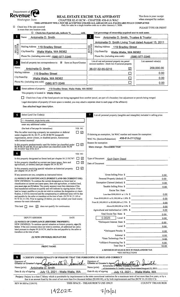 | 2 | 07/13/2021 | QCD | QUIT CLAIM DEED | SMITH ANTOINETTE D | SMITH ANTOINETTE D LIVING TRUST | | | $0.00 | 142022 | 2021-08518 |