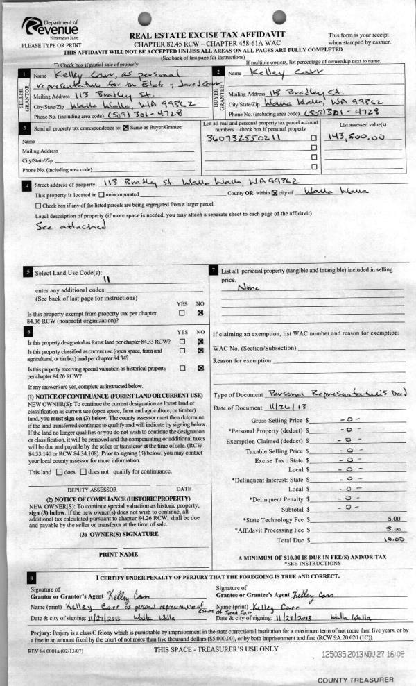 | 1 | 11/27/2013 | DPR | DEED OF PERSONAL REPRESENTATIVE | CARR JARED F & KELLEY L | CARR KELLEY | | | | 125035 | 2013-11589 |