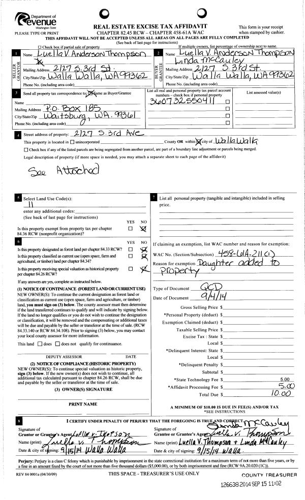 | 2 | 09/04/2014 | QCD | QUIT CLAIM DEED | THOMPSON LUELLA V ANDERSON | THOMPSON LUELLA V ANDERSON | | | | 126638 | 2014-06726 |