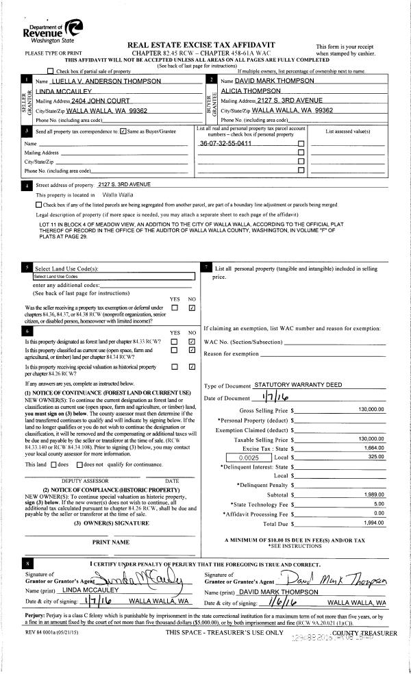 | 1 | 01/07/2016 | SWD | STATUTORY WARRANTY DEED | THOMPSON LUELLA V ANDERSON | THOMPSON DAVID MARK & ALICIA | | | $130,000.00 | 129488 | 2016-00175 |