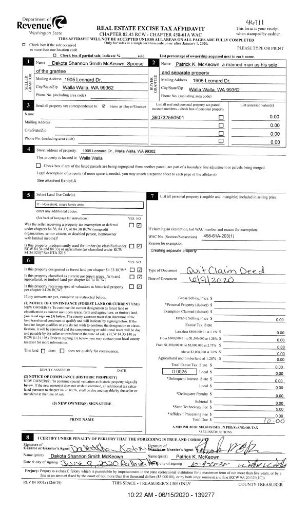 | 2 | 06/09/2020 | QCD | QUIT CLAIM DEED | MC KEOWN DAKOTA SHANNON SMITH | MC KEOWN PATRICK K | | | $0.00 | 139277 | 2020-05410 |