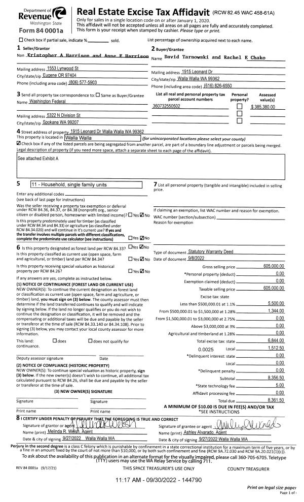 | 1 | 09/30/2022 | SWD | STATUTORY WARRANTY DEED | HARRISON KRISTOPHER A & ANNE E | TARNOWSKI DAVID & RACHEL E CHACKO | | | $605,000.00 | 144790 | 2022-08136 |