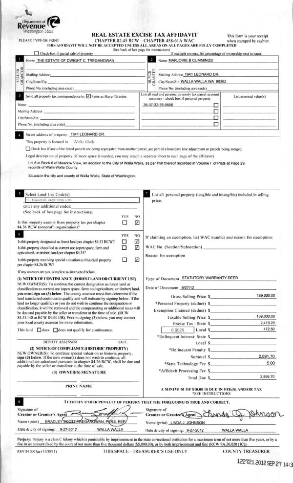 | 1 | 09/27/2012 | WARRANTY D | WARRANTY DEED | TREGANOWAN, DWIGHT C ESTATE OF | CUMMINGS, MARJORIE B | | | $189,000.00 | 122721 | 2012-08491 |