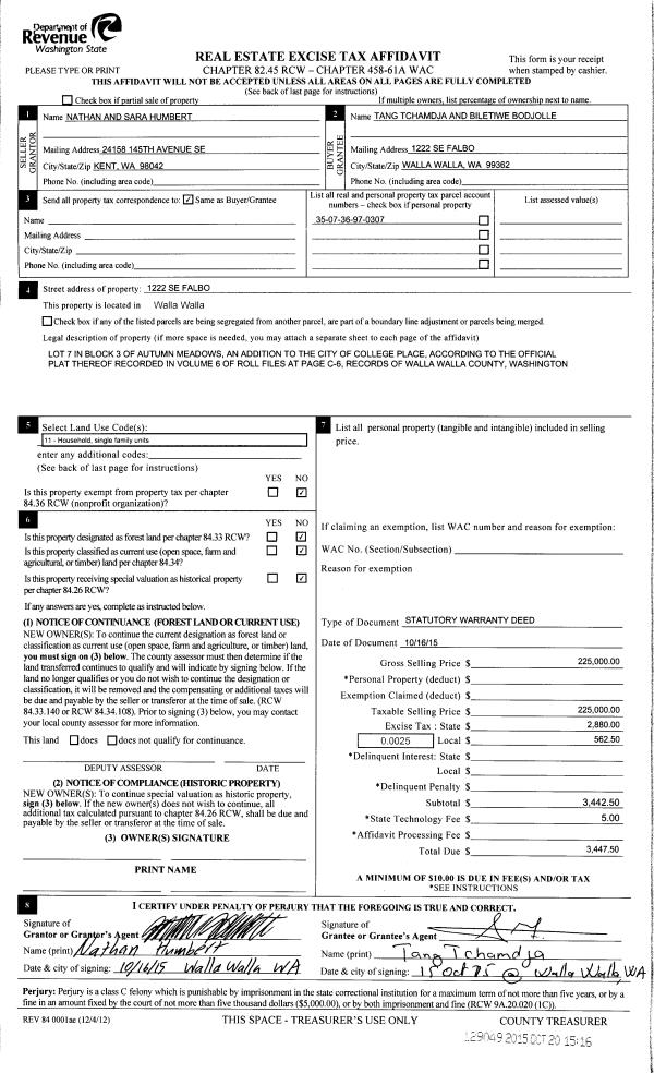 | 1 | 10/20/2015 | SWD | STATUTORY WARRANTY DEED | HUMBERT NATHAN & SARA A | TCHAMDJA TANG & BILETIWE BODJOLLE | | | $225,000.00 | 129049 | 2015-09180 |