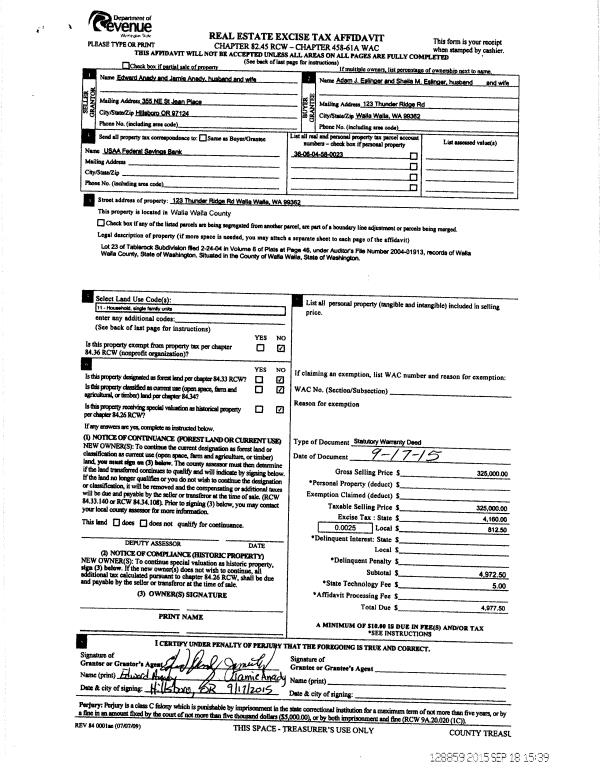 | 4 | 09/18/2015 | SWD | STATUTORY WARRANTY DEED | ANADY EDWARD & JAMIE | ESLINGER ADAM J & SHEILA M | | | $325,000.00 | 128859 | 2015-08216 |