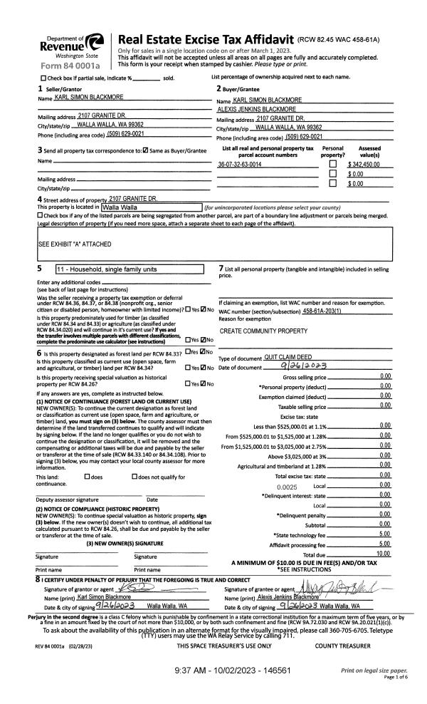 | 1 | 10/02/2023 | QCD | QUIT CLAIM DEED | BLACKMORE KARL SIMON | BLACKMORE KARL SIMON & ALEXIS JENKINS | | | | 146561 | 2023-05752 |