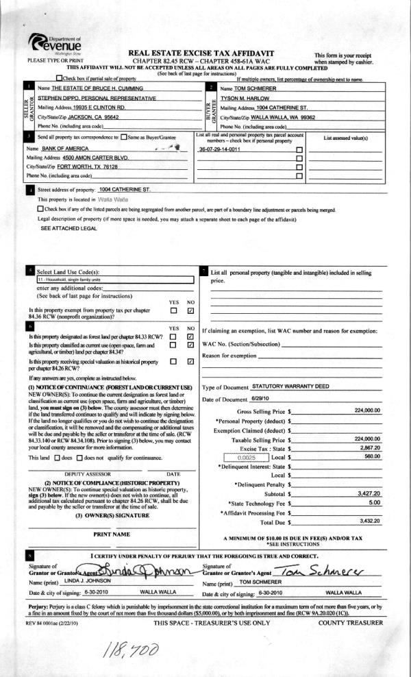 | 2 | 06/30/2010 | WARRANTY D | WARRANTY DEED | CUMMING, BRUCE H ESTATE OF | SCHMERER, TOM | | | $224,000.00 | 118700 | 2010-05097 |