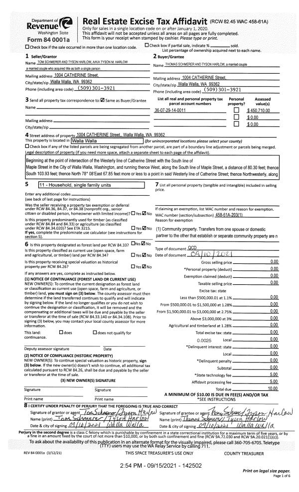 | 1 | 09/15/2021 | QCD | QUIT CLAIM DEED | SCHMERER TOM | SCHMERER THOMAS & TYSON HARLOW | | | $0.00 | 142502 | 2021-11398 |