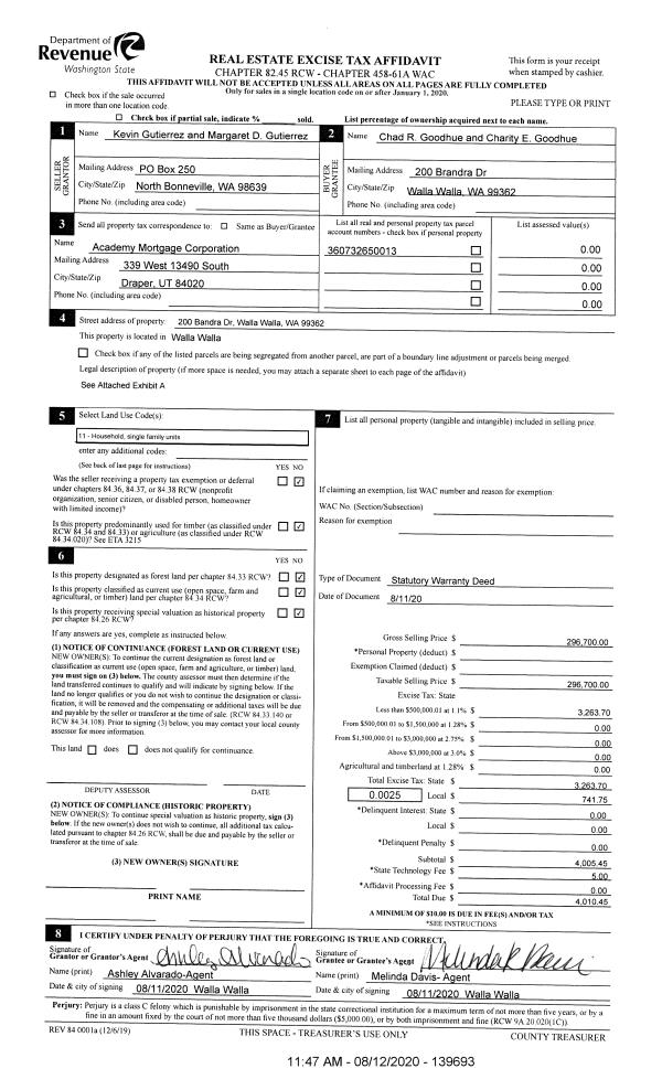 | 1 | 08/12/2020 | SWD | STATUTORY WARRANTY DEED | GUTIERREZ KEVIN G | GOODHUE CHAD R & CHARITY E | | | $296,700.00 | 139693 | 2020-07949 |