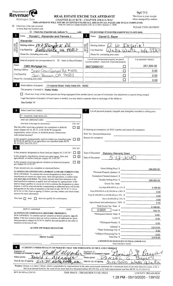 | 1 | 05/13/2020 | SWD | STATUTORY WARRANTY DEED | ALEXANDER RONALD L & PAMELA | BAYER DANIEL G | | | $289,900.00 | 139102 | 2020-04151 |