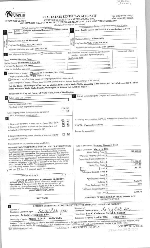 | 3 | 04/05/2016 | SWD | STATUTORY WARRANTY DEED | CHASE HERMAN J ESTATE OF | CARLSON BRET C & SARRAH L | | | $239,000.00 | 129964 | 2016-02496 |
