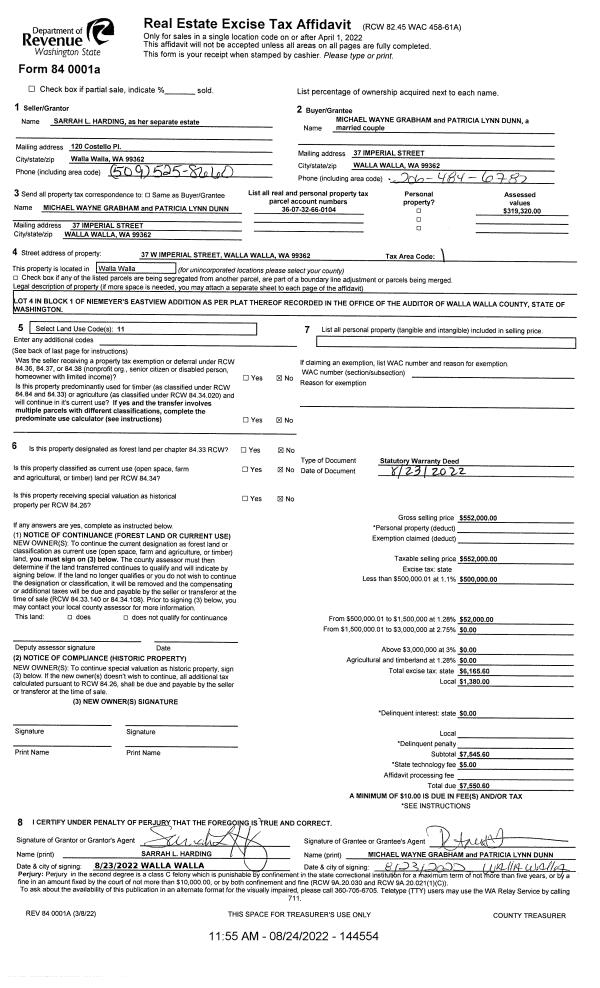 | 1 | 08/24/2022 | SWD | STATUTORY WARRANTY DEED | HARDING SARRAH L | GRABHAM MICHAEL WAYNE & PATRICIA LYNN DUNN | | | $552,000.00 | 144554 | 2022-07081 |
