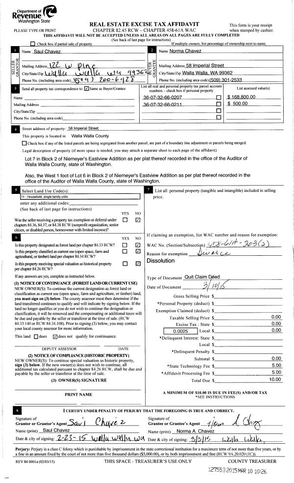| 3 | 02/20/2015 | COURT CASE | COURT CASE | CHAVEZ SAUL & NORMA | SANDOVAL NORMA ALICIA | | | | 0 | CC 14-3-00181-3 |