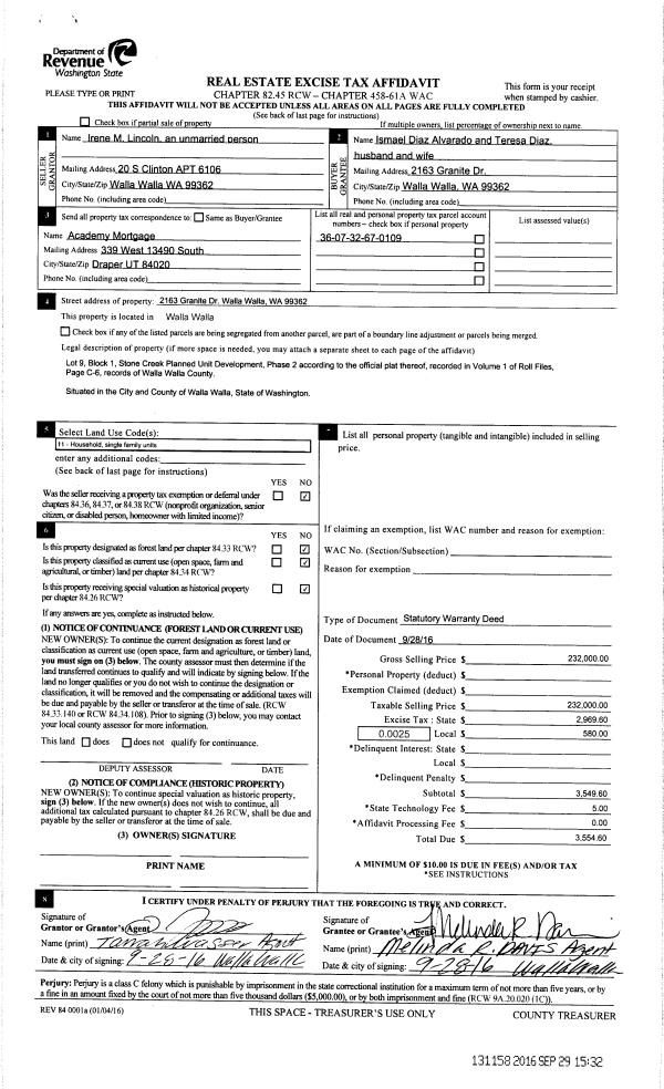 | Mailing Address: | TERESA DIAZ 2163 GRANITE DR WALLA WALLA, WA 99362 | % Ownership: | 100.0000000000% |