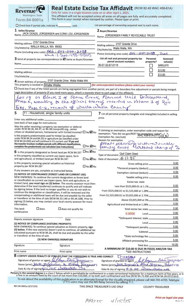 | 1 | 04/15/2025 | QCD | QUIT CLAIM DEED | JORGENSEN JACK D & EDNA LOU | JORGENSEN FAMILY REVOCABLE LIVING TRUST | | | | 149235 | 2025-01994 |