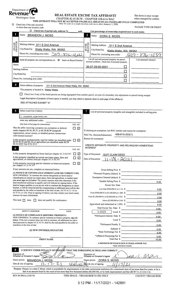 | 1 | 11/17/2021 | QCD | QUIT CLAIM DEED | MOSS BRANDON J | MOSS DORA S | | | | 142891 | 2021-13705 |