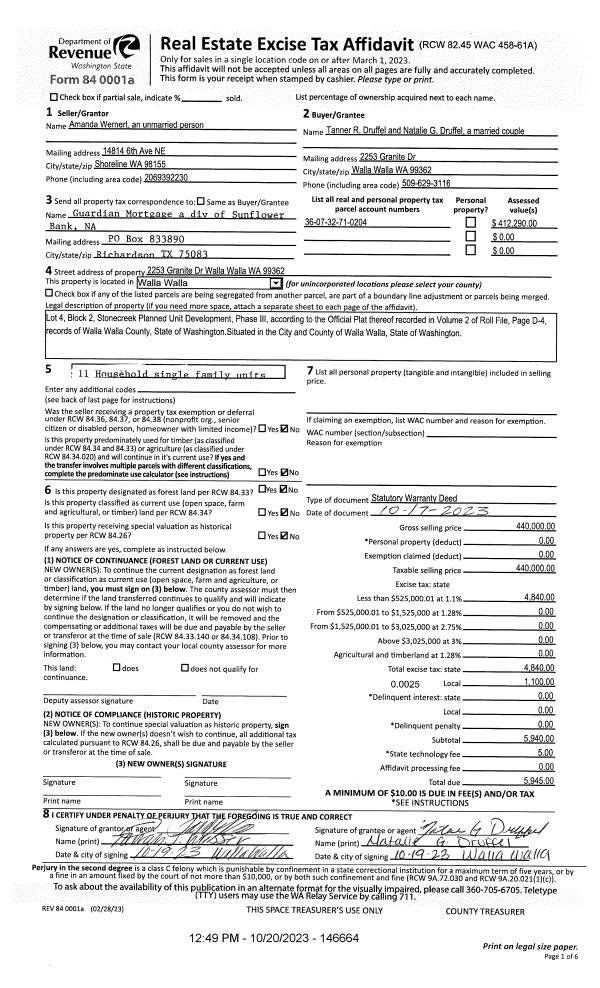 | 1 | 10/20/2023 | SWD | STATUTORY WARRANTY DEED | WERNERT AMANDA | DRUFFEL TANNER R & NATALIE G | | | $440,000.00 | 146664 | 2023-06174 |