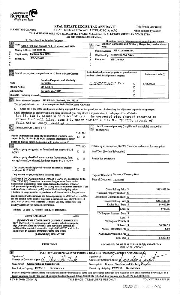 | 1 | 12/30/2016 | SWD | STATUTORY WARRANTY DEED | FINK GLENN & SHERRILL | CARPENTER BRANDON & KIMBERLY | | | $313,500.00 | 131689 | 2016-10791 |