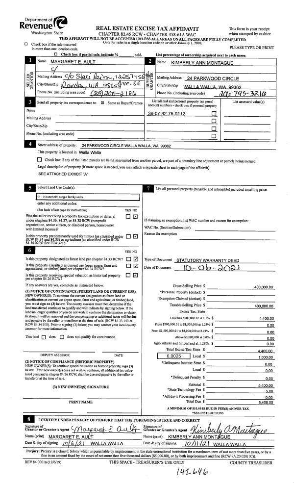 | 2 | 10/11/2021 | SWD | STATUTORY WARRANTY DEED | AULT MARGARET E | MONTAGUE KIMBERLY ANN | | | $400,000.00 | 142646 | 2021-12345 |