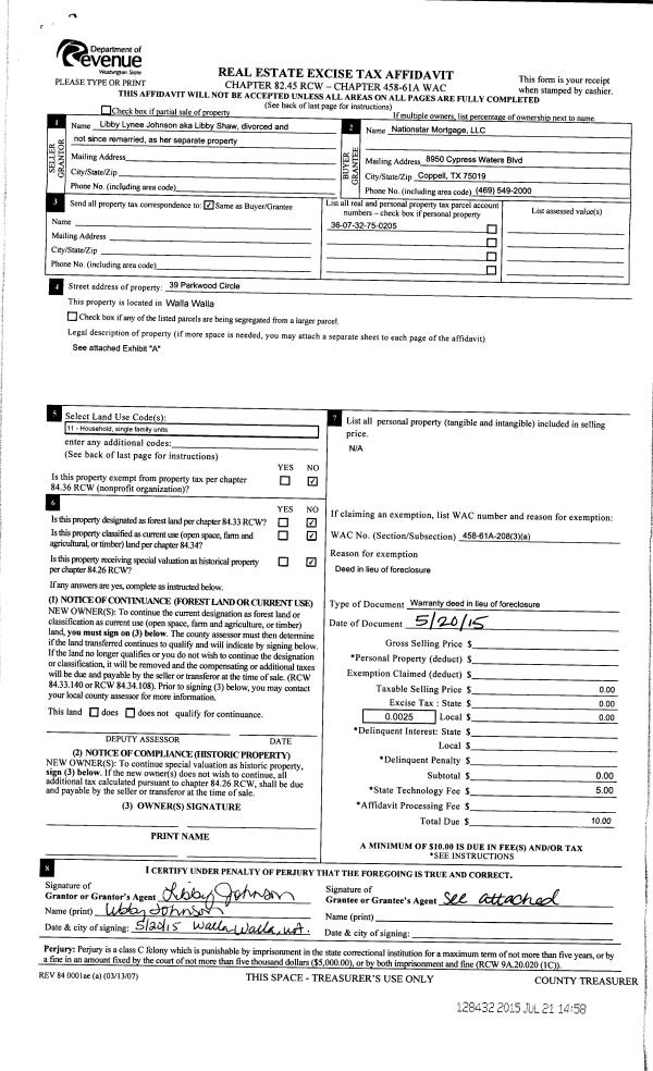 | 3 | 07/20/2015 | WARRANTY D | WARRANTY DEED | SHAW TOM & LIBBY | NATIONSTAR MORTGAGE LLC | | | $0.00 | 128432 | 2015-06206 |
