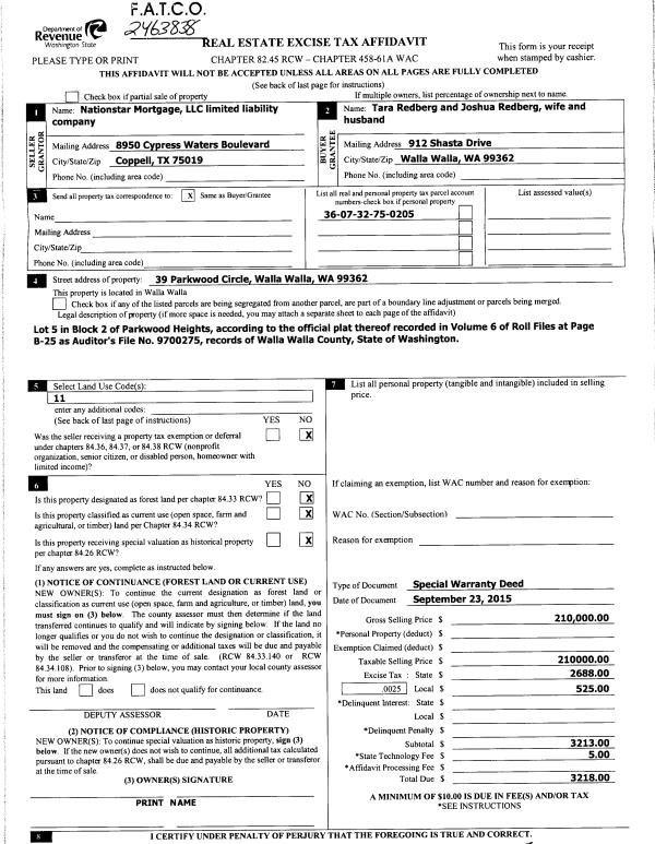 | 2 | 09/30/2015 | SWD | STATUTORY WARRANTY DEED | NATIONSTAR MORTGAGE LLC | REDBERG JOSHUA & TARA | | | $210,000.00 | 128907 | 2015-08582 |