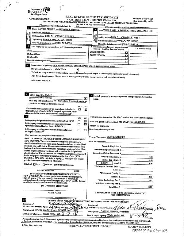 | 1 | 08/08/2018 | QCD | QUIT CLAIM DEED | LAIZURE DANIS & DONNA | WALLA WALLA DENTAL ARTS BUILDING LLC | | | $0.00 | 135299 | 2018-06515 |