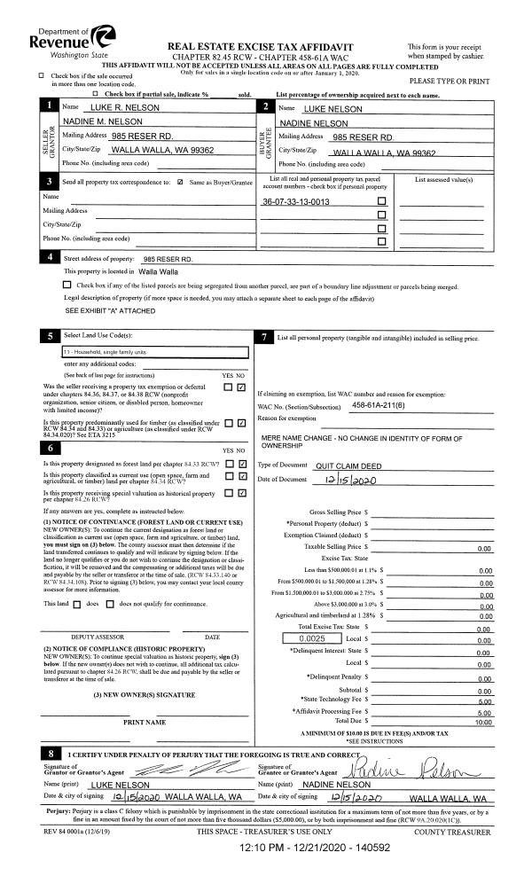 | 1 | 12/15/2020 | QCD | QUIT CLAIM DEED | NELSON LUKE R & NADINE M | NELSON LUKE & NADINE | | | $0.00 | 140592 | 2020-13528 |