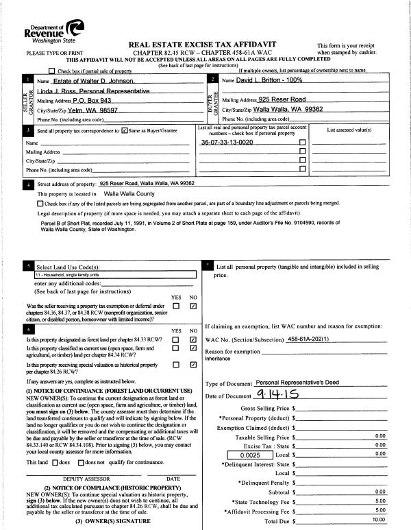 | 1 | 09/14/2015 | DPR | DEED OF PERSONAL REPRESENTATIVE | JOHNSON WALTER D ESTATE OF | BRITTON DAVID L | | | $0.00 | 128903 | 2015-08638 |